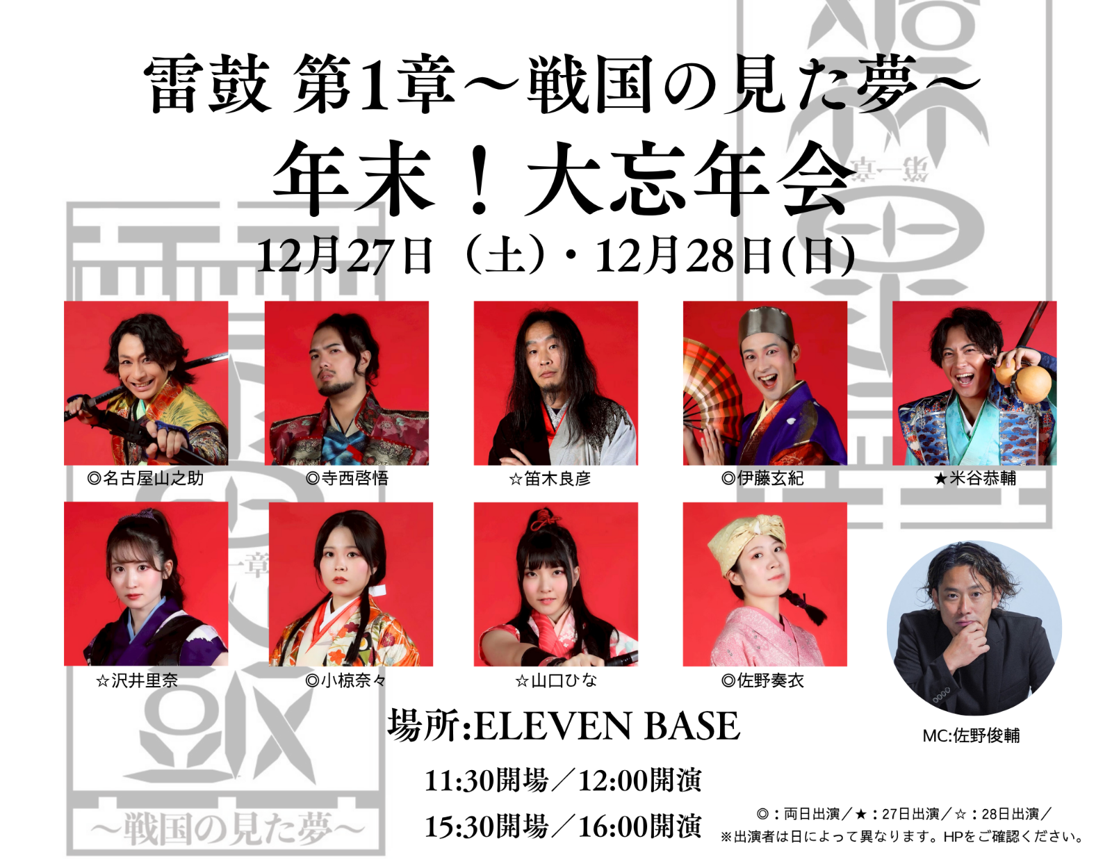 ■27日(土)出演 名古屋山之助 寺西啓悟 伊藤玄紀 米谷恭輔 小椋奈々 佐野奏衣 佐野俊輔MC ■28日出演 名古屋山之助 寺西啓悟 笛木良彦 伊藤玄紀 山口ひな 小椋奈々 沢井里奈 佐野奏衣 佐野俊輔MC ※笛木良彦は、2部のみの参加となります。 |